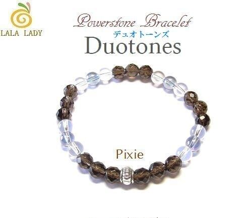 ※ご希望の腕周り(内周)サイズを選択してください。※サイズの目安は、実際に腕周りを計測し、その数値にプラス1.5~2cmがおススメサイズになります。ララレディーオリジナルブランド、「Pixie」(ピクシー:妖精)は、高品質・ロープライスにこだわり、企画・製造・販売を全て自社で行っています。デュオトーンズ モデルは、全体運・仕事運・癒し・健康運・厄払いをアップするストーンを集めました。ゴムひもは、柔軟性と耐久性に優れた日本製高品質モビロンゴムを採用。■AAクリスタル:強いヒーリングエネルギーを作り出し、全てを浄化し、悪運を退け、健康と幸福を与えてくれると言われています■スモーキークォーツ:心の状態をリラックスした状態へと導き、ストレスを和らげ、知性を高め、潜在能力引き出すパワーがあり、才能を開花させてくれます。■コスモオーラ:在的能力を引き出し、やる気や決断力を高めます。■内径サイズ:14cm~22cm ■スモーキークォーツ64面カット:6mmサイズ■AAクリスタル:6mmサイズ■コスモオーラ:6mmサイズ■連結パーツ:5.5mmx6.5mm■モビロンゴムひも0.8mm(太さ) ※照明、光の具合により、多少イメージと違って見える事があります。