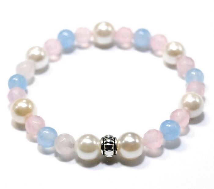 ※ご希望の腕周り(内周)サイズを選択してください。※サイズの目安は、実際に腕周りを計測し、その数値にプラス1.5~2cmがおススメサイズになります。オリジナルブランド「Pixie」(ピクシー:妖精)より、パールブレスレットが新発売!カジュアルからフォーマルまで幅広くご使用いただけます。■シェルパール:パールは守護のパワーが強く、ストレスで疲れた体を癒し、守ってくれる効果がある。身につけると女性の美しさ、柔らかさ、エレガントさを引き出し、魅力と愛情、優しさを高めます。■ローズクォーツ:愛を象徴し、恋愛、家族の愛、友人への愛、物や仕事への愛、母性愛など、あらゆる愛の石と呼ばれる。特に恋愛に対しては効果が高く、片思い、出会い、良縁、結婚などに効果的。■アクアブルー・ジェイド:古くからお守りに使用され、学業や商売などを成功へと導くパワーストーンです。 ■内径サイズ:14cm~19cm ■シェルパール:8mmサイズ ■ローズクォーツ 64面カット:8mm ■アクアブルー・ジェイド:6mm ■連結パーツ:5.5mmx6.5mm ■モビロンゴムひも0.8mm(太さ) ※照明、光の具合により、多少イメージと違って見える事があります。※各ストーンのサイズ等を確認のうえ、ご検討ください。