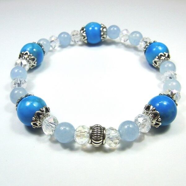 ※ご希望の腕周り(内周)サイズを選択してください。※サイズの目安は、実際に腕周りを計測し、その数値にプラス1.5~2cmがおススメサイズになります。オリジナルブランド「Pixie」(ピクシー:妖精)より、パワーストーンとキラッキラのクリスタルガラスをミックスしたブレスレットが新発売! ■アクアブルー・ジェイド:古くからお守りに使用され、学業や商売などを成功へと導くパワーストーンです。■ハウライト:ハウライトは気持ちを清らかにし、寂しさや悲しさなどのマイナスの感情を和らげてくれるので、身体にストレスや疲れがたまっている時に効果的です。トラブルを解決する道を気づかせ、意識を高く引き上げてくれます。脳を活性化させ、頭脳明晰にする。 ■内径サイズ:14cm~20cm ■ハウライトターコイズ(染め):10mmサイズ ■アクアブルージェイド:6mm ■クリスタルガラスビーズ:ボタンカット・レインボー6mmx4mm ■連結パーツ:5.5mmx6.5mm ■金属パーツ:花座■モビロンゴムひも:0.8mm(太さ) ※照明、光の具合により、多少イメージと違って見える事があります。※各ストーンのサイズ等を確認のうえ、ご検討ください。