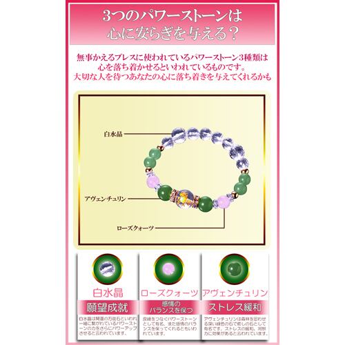 「強運・かえるカード」付き! 〇無事かえるブレスレット 〇日本では『蛙』そのものより「かえる」という言葉の語呂から、交通安全や縁起ものとして人気があります。例えば「人を迎える」「無事に帰る」「お金が返る」「災いを変える」「若返る」など言葉の中に「かえる」が入っています。また、蛙は卵をたくさん産むことから子孫繁栄の象徴にもなっているようです。そして中国でも裏庭に蛙が住んでいると危険や悪運から守ってくれるといわれているそうです。【白水晶】邪気祓い 願望成就【ローズクォーツ】恋愛運 感情バランス均衡【アベンチュリン】ストレス緩和 洞察力 【材質・サイズ等】白水晶1個(12mm珠 蛙刻印)、2個(10mm珠/128面カット)、6個(8mm珠/128面カット)、4個(6×3mm/カット)、ローズクォーツ2個(8mm珠)、アベンチュリン2個(10mm珠)、4個(8mm珠)、ロンデル2個(8×4mm 真鍮/ラインストーン)、銅玉4個(5mm珠)[サイズ]約17cm(内径)[重量]約18g[中糸]ポリウレタンゴム[付属品]専用巾着袋、強運・かえるカード[個装サイズ]縦15.8×横10.0×高さ2.0(cm)/28.0(g)