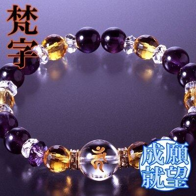 【白水晶】邪気祓い・浄化全体運願望成就【黄水晶】金運・財運商売繁盛繁栄・富貴【紫水晶】邪気祓い仕事運精神の安定。守護梵字(守護尊)は仏教、とくに密教と密接な結びつきがあり、古代サンスクリット語の基礎にもなっている文字で、各仏菩薩たちをあらわしています。そして『生まれ年(干支)』によって決まる『守護尊』をあらわしたものを守護梵字といいます。この8種類の梵字にはそれぞれ1文字で御仏の功徳をあらわすとされ、干支の守り本尊とされています。<子>千手観世音菩薩千の手と千の眼を持つ<丑・寅>虚空蔵菩薩広大無辺の功徳を持つ<卯>文殊菩薩普遍の智慧をつかさどる<辰・巳>普賢菩薩大いなる悟りの心を象徴<午>勢至菩薩智慧の光で全てを照らす<未・申>大日如来大宇宙の真理を形つくる<酉>不動明王煩悩を砕き平安を守護<戌・亥>阿弥陀如来永遠の安らぎをもたらす。【材質・サイズ等】白水晶1個(12mm珠 梵字刻印)、10個(6×3mm/カット)、黄水晶6個(8mm珠/128面カット)、アメジスト10個(8mm珠)、2個(8×4mm/カット)、ロンデル2個(6×3mm 真鍮/ラインストーン)[サイズ]約18cm(適応サイズ17cm)[重量]約17g[中糸]ポリウレタンゴム[付属品]専用巾着袋[個装サイズ]縦15.8×横10.0×高さ2.0(cm)/27.0(g)