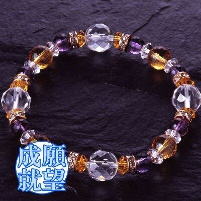 風水開運ブレスレット。幸福を招くパワーストーン!【材質・サイズ等】白水晶4個(10mm珠/32面カット)、8個(6×3mm/カット)、黄水晶4個(8mm珠/128面カット)、8個(6×3mm/カット)、アメジスト8個(6mm珠/128面カット)、ロンデル8個(6×3mm 真鍮/ラインストーン)[サイズ]約19cm(適応サイズ17-18cm)[重量]約13g[中糸]ポリウレタンゴム[付属品]専用巾着袋[個装サイズ]縦15.8×横10.0×高さ2.0(cm)/23.0(g)