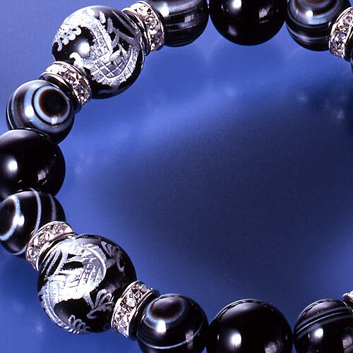 隆盛運をもたらす「龍のキーホルダー」付き! 護符ブレス。飛翔龍×神眼石×邪気祓石 古来より『龍』は神仏の化身、守護神として拝まれています。龍を象ったものを身につけると魔除け・厄除けの効果があり、財産を増やすことで自ずと幸福も訪れるといわれてきました。 天眼石は厄除けの効果があり、災いから身を守ってくれると古来より信じられている神秘の石です。メノウは縞模様があることで知られていますが、その中でもまれに年輪状の『眼』を持つ石が見つかります。これは『神の眼』として珍重されており、身につけることで悪霊が追い払われ、運が開けるといわれています。中国では古くから幸運や財運を招く石としても珍重されてきました。そしてオニキスは古くから邪念や邪気を祓い、意志や信念を強めて精神とからだを安定させるパワーがあるといわれています。「精神力を強くしたい人」「邪念・邪気を祓いたい人」にぴったりです。【材質・サイズ等】天眼石8個(10mm珠)、オニキス4個(14mm珠 龍刻印)、4個(12mm珠)、ロンデル 8個(8×4mm 真鍮/ラインストーン)[サイズ]約18cm(内径)[重量]約42g[中糸]ポリウレタンゴム[付属品]専用巾着袋、龍のキーホルダー×1個[個装サイズ]縦15.8×横10.0×高さ3.0(cm)/66.0(g) [付属品]龍パーツ 1個(30×3mm 真鍮/ロジウムメッキ)/サイズ:約9.5cm、重量:約14g、金具:スチール(ナス型リングキーホルダー)