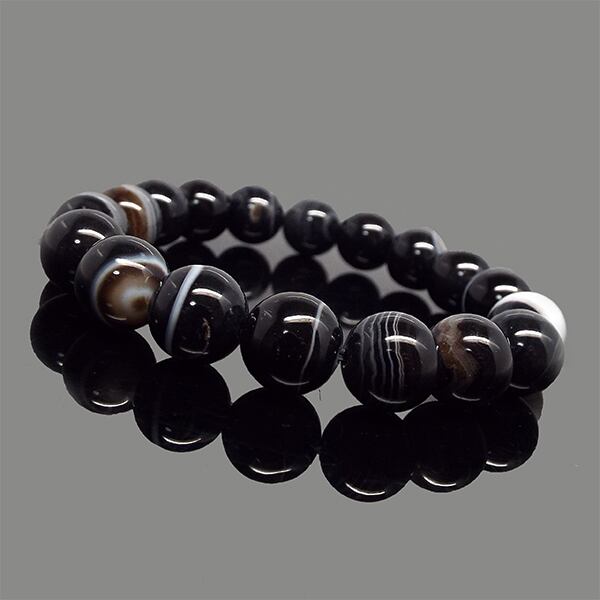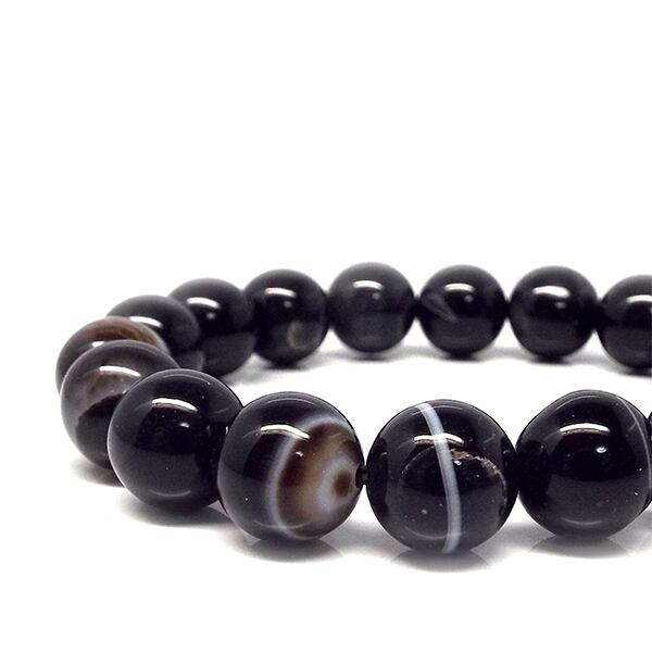 ■ご入金確認後、4~6営業日以内に発送いたします。■人気の黒縞瑪瑙(くろしまめのう)です。一玉、一玉、模様が違うので、見ていて飽きない、自然が長い長い年月をかけてつくりだした模様にうっとりとしてしまいます。カルセドニーが成長する過程で少しずつ異なる成分のものが沈殿を繰り返し縞模様が形成されたもので、それを丸く磨くことで、まるで眼のような模様が浮かび上がります。【サイズ・素材】内周:約16cm 玉サイズ:約10mm 黒縞瑪瑙 ※商品画像の色が見る環境によって現物と異なる場合があります。