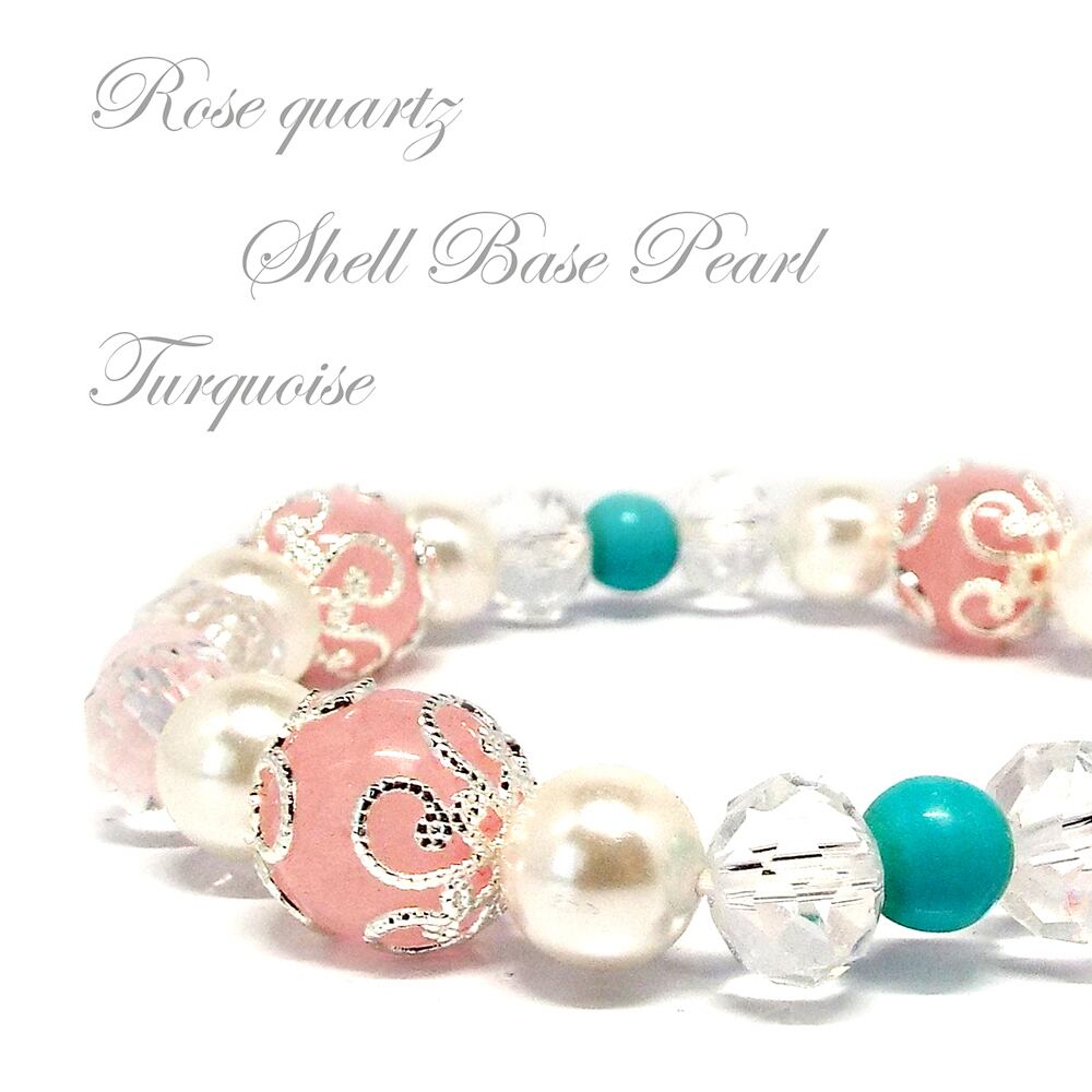 ■ご入金確認後、4~6営業日以内に発送いたします。■ターコイズとローズクォーツの大人可愛いデザインです☆モチーフにローズクォーツを使用しているので、女性の方におすすめです☆男性の方は彼女・奥様・お母様へのプレゼントにいかがですか?♪ ★ローズクォーツ:愛と優しさの象徴の天然石。女性の美しさや母性を引き出し、輝きをもたらすことで異性を引き寄せると言われています。 ★ターコイズ:人生の守護石。成功と安定をもたらす天然石で、出世の石として有名です。判断力や実行力を高め、積極性をもたらすとも言われ、夢・目標を叶える効果などがあると言われています。【サイズ・素材】内周:約16cm 玉サイズ:ローズクォーツ 10mm・6mm シェルパール 8mm ターコイズ練り 6mm ※商品画像の色が見る環境によって現物と異なる場合があります。