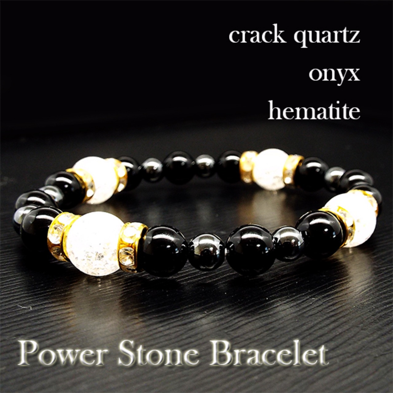■ご入金確認後、4~6営業日以内に発送いたします。■シンプルで飽きのこないデザインですので、 長くご愛用頂けます♪ ”クラック水晶”マイナスのエネルギーを浄化、病気や事故といったトラブルを回避して、あらゆる幸運、健康、成功をサポートしてくれる水晶と言われています。 'オニキス'自分自身の中心軸をしっかりと安定させる石で着実に目標を実現するために地に足を着けた行動をするよう導いてくれる石とされております。 'ヘマタイト'「勝利へ導く石」といわれるヘマタイトは、積極的に行動することを助け、困難を乗り越えて目標達成へと導いてくれるとされます。マイナスのエネルギーを取り去り、ポジティブなエネルギーに変える効果があるとされますので、ストレスでイライラしている人や他人の影響を受けやすい人にもおすすめです。【サイズ・素材】内周:約17cm 玉サイズ:クラック水晶 10mm オニキス 8mm ヘマタイト 6mm ※商品画像の色が見る環境によって現物と異なる場合があります。