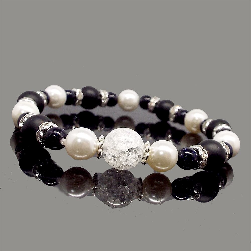 ■ご入金確認後、4~6営業日以内に発送いたします。■品の良いパールとの組み合わせで洋服を選ばず、これ1本でコーディネートが引き締まります♪ シェルパール:「月のしずく」「人魚の涙」と呼ばれ邪気から身を守り、愛を高める効果があり異性の心を引きつける恋の宝石とされ、母性を高めて困難に打ち勝つ忍耐強さをもたらしてくれる事から、安産のお守りとしても人気を集めています。 水晶:強い力で全てを浄化し、魔除け・幸せをもたらす石の基本。 オニキス:強い魔除けの効果。前に進むための忍耐力や意思の強さを与えてくれ、他人の悪意を跳ね返して身を守る「自己防衛の石」と呼ばれています。【サイズ・素材】内周:約17cm 玉サイズ:マットオニキス 8mm シェルパール 8mm クラック水晶 10mm ブルーゴールドストーン 6mm ※商品画像の色が見る環境によって現物と異なる場合があります。