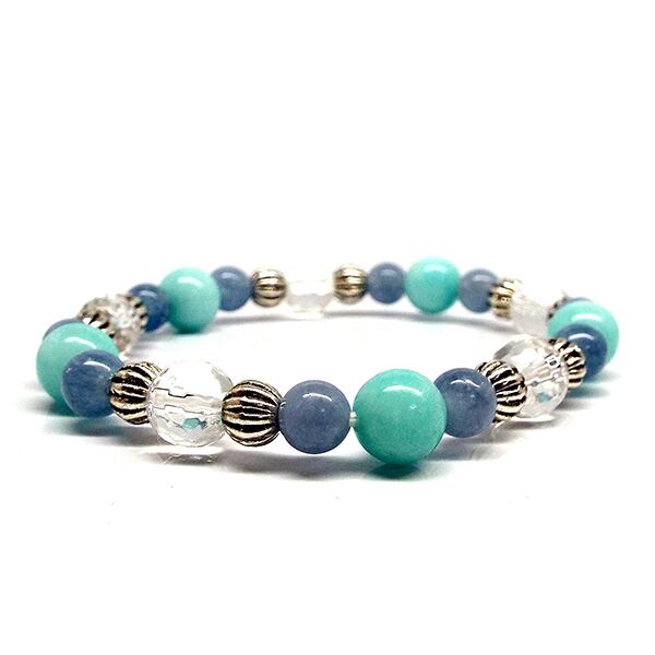 ■ご入金確認後、4~6営業日以内に発送いたします。■心に働きかける癒し系ストーンのアクアマリン・アマゾナイトブレスレット♪淡い水色がおだやかな気持ちをもたらしてくれるアクアマリンにネガティブな感情を洗い流すアマゾナイトを組み合わせました☆アクアマリンとアマゾナイトの組み合わせは、持ち主のチャレンジ精神を育み、ポジティブな精神に導く効果があるといわれています。勇気をも たらす相性とされています。自信のなさや自己否定の気持ちを癒し、前向きな気持ちを与えてくれるでしょう。持ち主の可能性を広げる助けに なるともいわれています。【サイズ・素材】内周:約17cm 石のサイズ:アクアマリン 6mm アマゾナイト 8mm クリスタル ミラーボールカット 8mm ※商品画像の色が見る環境によって現物と異なる場合があります。
