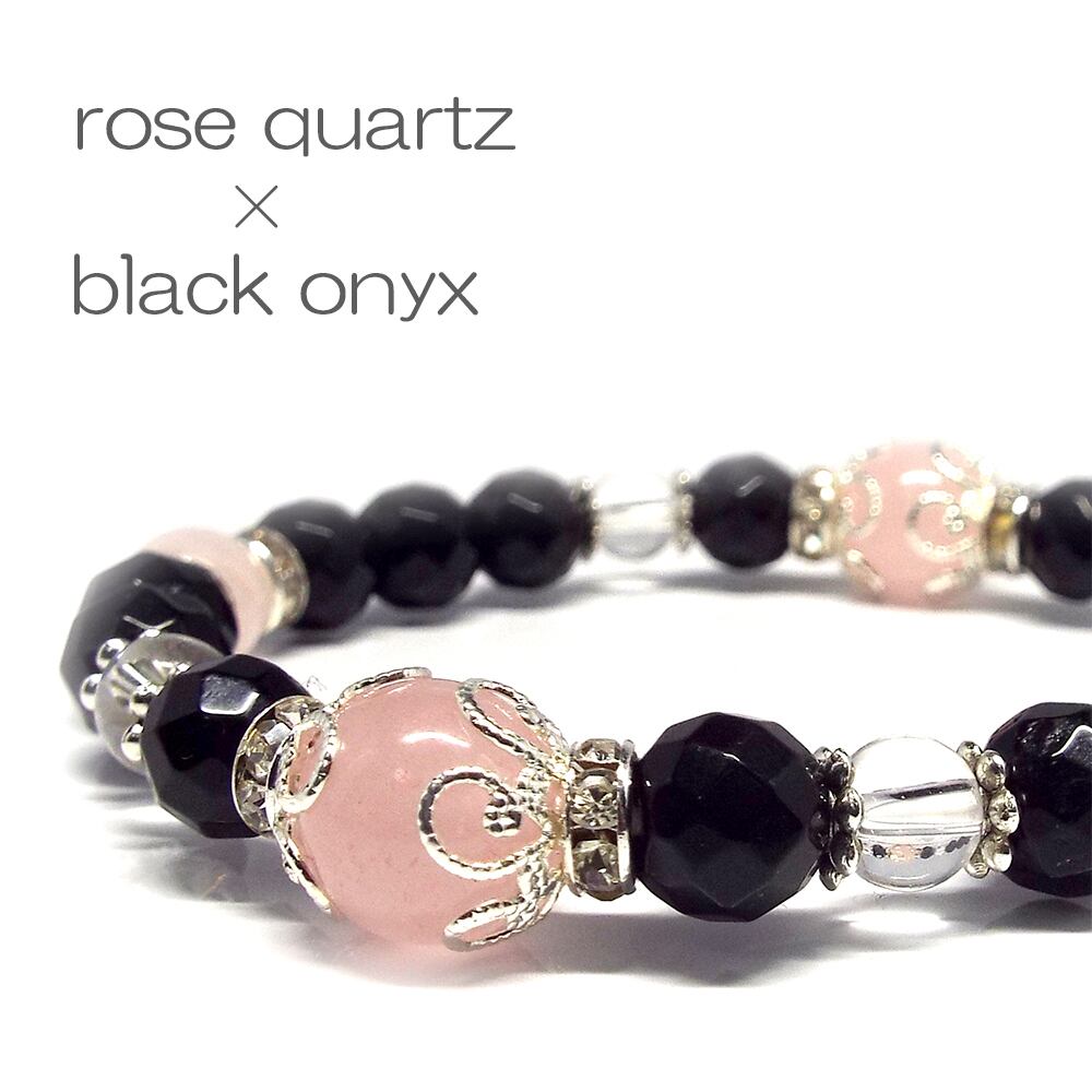 ■ご入金確認後、4~6営業日以内に発送いたします。■やさしく輝くローズクォーツと漆黒の輝きのオニキスをメタルビーズと花座でまとめたキュートでシックなブレスレットができました☆相反するような2つのカラーの石をシルバーで上品にまとめおしゃれ感抜群です。若い女性はもちろん、普通のパワーストーンには飽きてきたなぁ…って思われている方にも新鮮な感じで着けていただけるブレスレットです♪ローズクォーツは女性なら一つは持っていたいパワーストーンの1つ。自分を愛する気持ちを大切にし、また人を愛する気持ちを高め、内面からきれいになれるパワーを与えてくれる石です。そのローズクォーツにさらにオニキスの心身を安定させるパワーや目標を達成させるパワーをプラスしたとても頼りになるブレスレットです。【サイズ・素材】内周:約17cm 石のサイズ:ローズクォーツ 10mm・8mm オニキス 64面カット 8mm 水晶 6mm ※商品画像の色が見る環境によって現物と異なる場合があります。